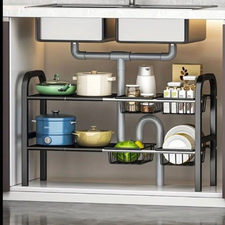 حوّل تنظيم مطبخك مع رف التخزين تحت الحوض الخاص بنا، المصمم لتعظيم المساحة وتعزيز الوظائف. مصنوع من المعدن المتين، يتميز هذا الرف بلمسة نهائية سوداء غير لامعة تتكامل مع أي ديكور مطبخ حديث.