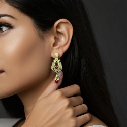 هذه الأقراط المطلية بالذهب مصممة بتفاصيل معقدة من الفيلغري ومزينة بحجارة كريمة حمراء نابضة بالحياة. مصنوعة من أجل الأناقة والرقي، تقدم مظهرًا فاخرًا مثاليًا للمناسبات الخاصة أو لتعزيز الملابس اليومية. الأقراط خفيفة الوزن، مما يضمن الراحة أثناء إحداث بيان أزياء جريء. قم بارتدائها مع فستانك المفضل أو مجموعة المساء الخاصة بك للحصول على مظهر لا يُنسى حقًا.