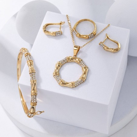 اكتشف سحر طقم المجوهرات المستوحى من البامبو، والذي يتضمن قلادة، وأقراط، وسوار، وخاتم مزين بالكريستالات اللامعة.