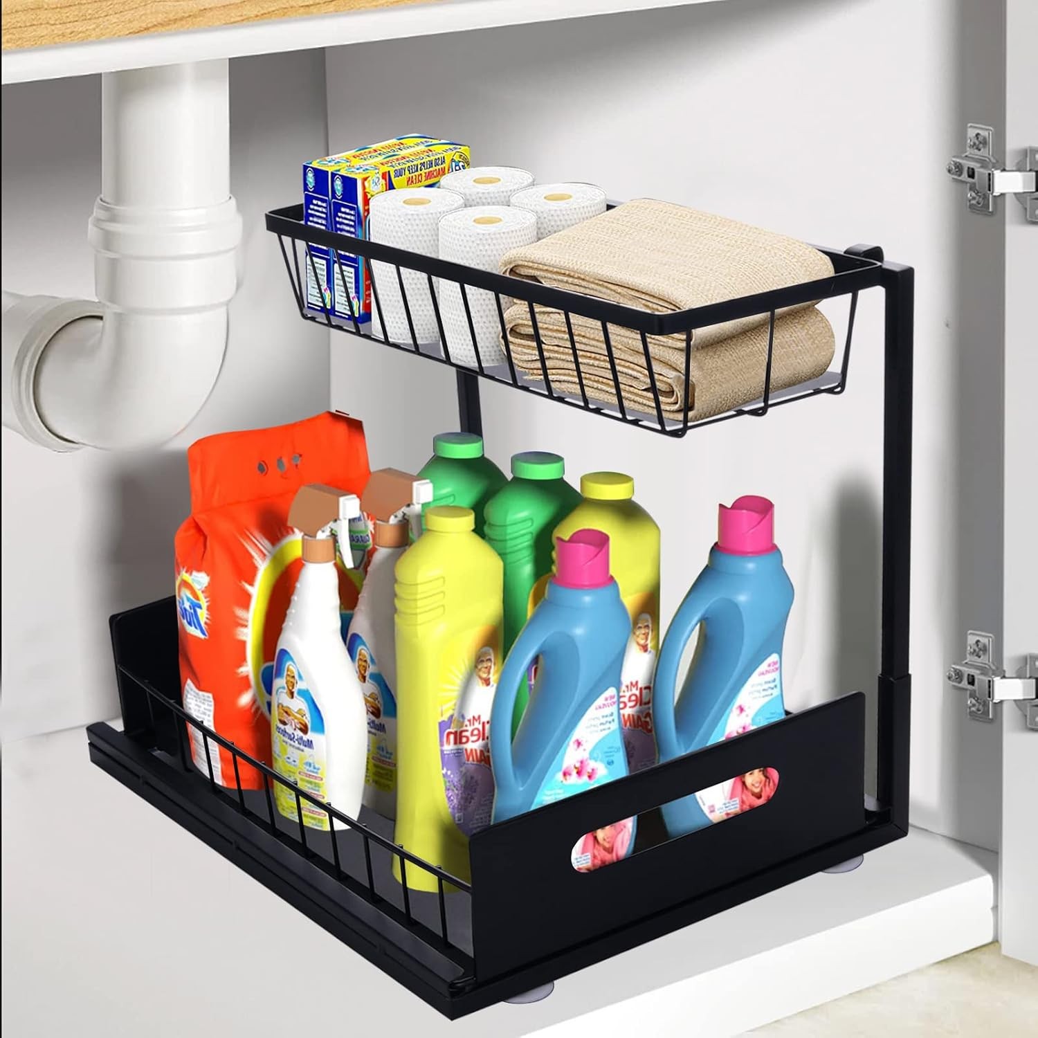 قم بزيادة مساحة مطبخك مع هذا المنظم الأنيق تحت الحوض الذي يحتوي على سلتين منزلقين للوصول السهل إلى مستلزماتك.