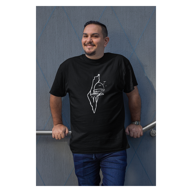 اللون الأسود اللافت يوفر تنوعاً، مما يتيح لك تنسيقه بسهولة مع الجينز أو الشورتات أو السراويل الرياضية. الميزة البارزة هي التصميم الجرافيكي الفريد على المقدمة - خريطة مفصلة لفلسطين مزينة بهيكل قبة أيقوني. هذه التمثيل الفني لا يضيف فقط لمسة جمالية بل يحتفل أيضاً بالهوية الثقافية.