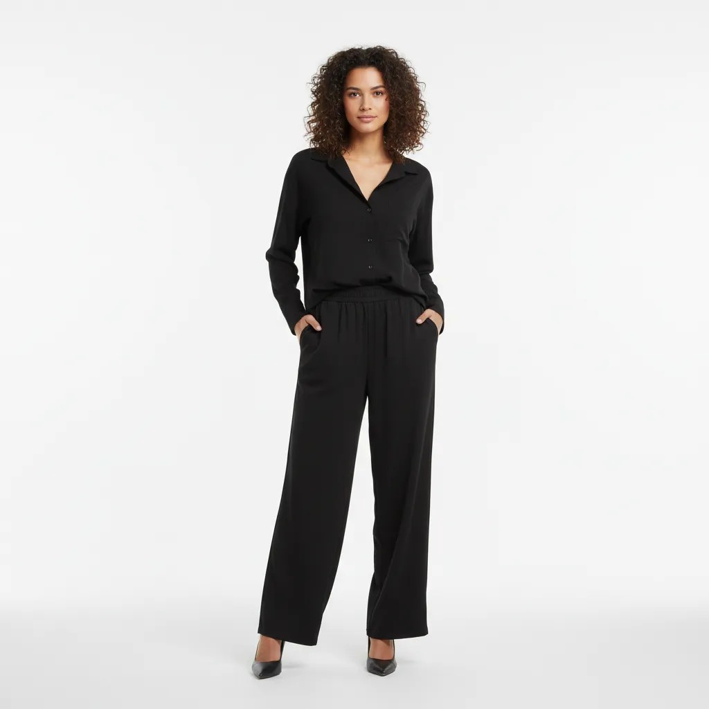 هذه البدلة السوداء الأنيقة هي عنصر أساسي في أي خزانة أزياء متقدمة. مصنوعة من قماش عالي الجودة، تتميز بياقة أنيقة وقصة مريحة تتدلى بشكل جميل. لون البدلة الأسود الكلاسيكي يجعلها متعددة الاستخدامات سواء في النهار أو الليل، بينما تضمن الخصر المرن ملاءمة مريحة. مثالية للعمل، أو للخروج في الليل، أو للنزهات غير الرسمية، تجمع هذه القطعة بين الرقي والسهولة.