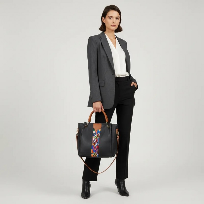 حقيبة يد أنيقة باللون الأسود مع حزام ملون