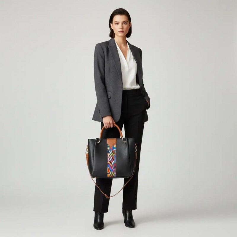 أنيقة ومتعددة الاستخدامات، تتميز هذه الحقيبة السوداء بحزام ملون نابض بالحياة يضيف لمسة من الأناقة لأي زي.