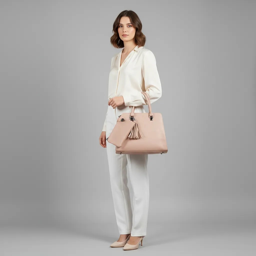 حقيبة يد بيج أنيقة مع حقيبة مطابقة