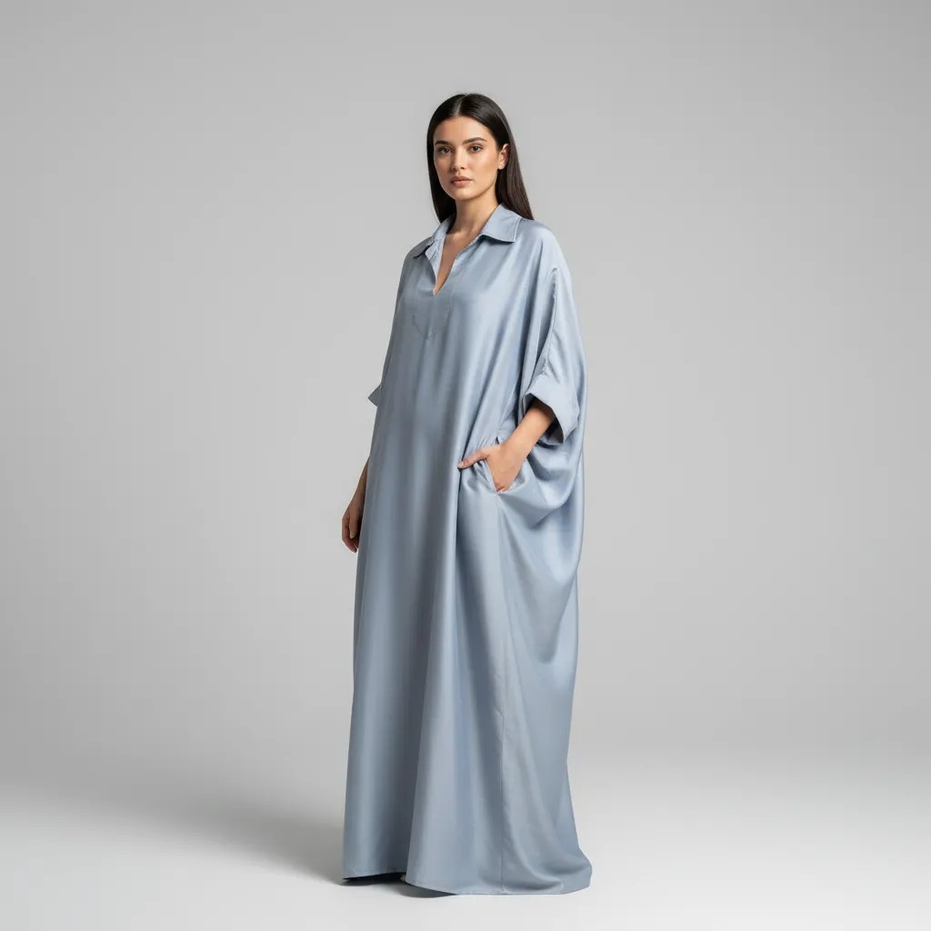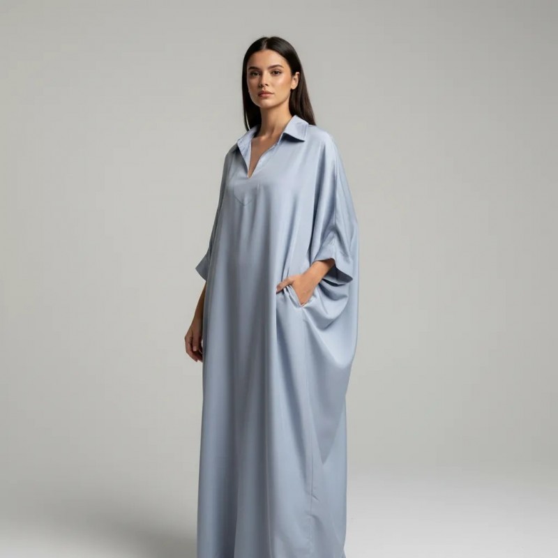 فستان كفتان أزرق أنيق ومريح، مثالي لأي مناسبة.