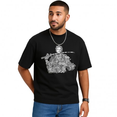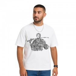الميزة البارزة في هذا القميص هي تصميمه الجرافيكي المذهل. يعرض الجزء الأمامي رسمًا معقدًا لشخص يحمل سيفًا، محاطًا بأنماط تفصيلية تعكس الذوق الفني. تخلق لوحة الألوان الأحادية من الأسود والرمادي تباينًا جريئًا مع القماش الأبيض، مما يضمن لك أن تترك انطباعًا أينما ذهبت.