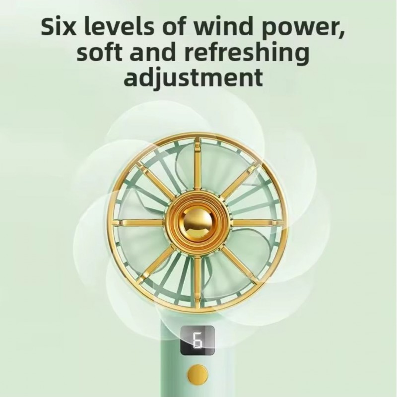 Stay cool on the go with our portable handheld fan. Designed for convenience, this compact fan features an ergonomic handle and a stylish mint green body with elegant gold accents. Perfect for outdoor activities or travel, it offers adjustable speeds and a lightweight design, ensuring you enjoy refreshing airflow wherever you are. Experience comfort in style!