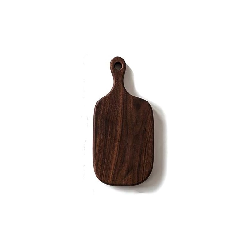 The paddle-like shape of the boards features a rounded rectangular body with an extended handle, complete with a convenient hanging hole for easy storage. Measuring just right for various uses, these moderately sized boards are perfect for serving or preparing food.