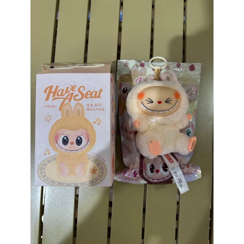 This plush toy measures approximately 6-10 inches in height, making it easy for little hands to hold during adventures or quiet moments. The packaging is just as captivating as the toy itself; adorned with playful illustrations of Labubu against a light background, it includes the text Have A Seat in an inviting font that draws attention.