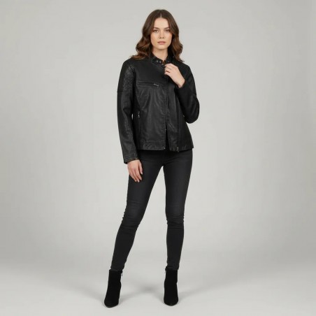 This women's classic black leather jacket is a must-have for any fashion-forward wardrobe. Crafted from high-quality leather, it features a sleek design with a modern fit. The jacket offers versatility and sophistication, whether you're dressing up for a night out or adding a chic layer to your casual look. With its durable construction and stylish appeal, this jacket will quickly become your go-to piece for all seasons.