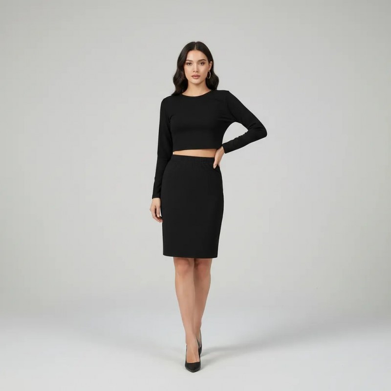 Step into sophistication with our Chic Black Two-Piece Set, featuring a sleek long-sleeve crop top and a fitted pencil skirt. This ensemble is designed to flatter your silhouette while providing ultimate comfort. Ideal for both casual and formal settings, this timeless set is a must-have in your wardrobe. Pair it with heels for an upscale look or dress it down with flats for a casual outing.