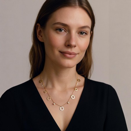 Fabriqué avec une attention exquise aux détails, ce collier en or élégant met en valeur une série de cercles délicatement liés. Son design minimaliste en fait un accessoire polyvalent, adapté aux sorties décontractées comme aux occasions formelles. Le collier est léger et confortable à porter, garantissant qu'il devienne un incontournable de votre collection de bijoux. Que vous vous habilliez pour un événement spécial ou que vous ajoutiez une touche chic à votre look quotidien, ce collier est le choix parfait.