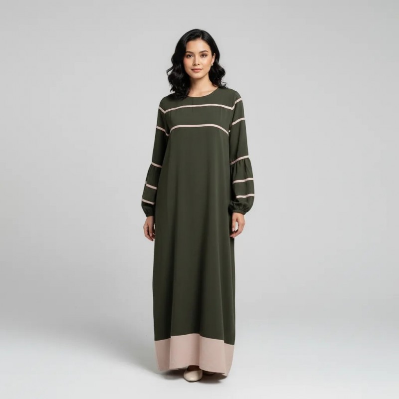 Affichez votre style avec cette magnifique robe maxi à manches longues, conçue pour offrir à la fois confort et élégance. La robe présente un design intemporel avec des détails rayés subtils sur le corsage et les manches, ajoutant une touche de modernité. Fabriquée à partir de matériaux de haute qualité, elle garantit une coupe flatteuse et un confort tout au long de la journée. Que vous assistiez à un événement spécial ou que vous profitiez d'une journée décontractée, cette robe est votre choix incontournable pour une élégance sans effort.