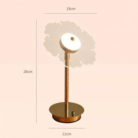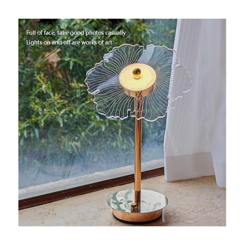 La caractéristique remarquable de cette lampe est son abat-jour unique en couches qui ressemble à une fleur ou un éventail complexe. Principalement blanc avec des lignes délicates créant une texture légère, il attire l'attention tout en fournissant un éclairage ambiant doux. Le disque central abrite un petit bouton métallique qui sert de commutateur de contrôle facile pour ajuster les niveaux de luminosité.